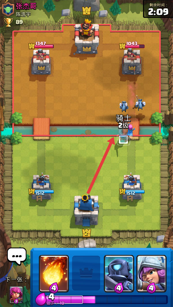 3、接着派出【骑士-2级】过桥进攻,同时注意敌方可能的防守卡牌,确保骑士能对塔造成有效伤害。