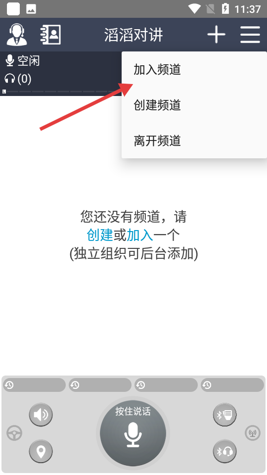 2.手机登录滔滔对讲,在对讲界面右下角有两个圆形图标.左侧为手咪按键指,右侧为蓝牙音频指示(图标2).首先点击图标2,确认打开手机蓝牙,搜索并连接3.此时回到对讲界面,尝试按下手咪按键.