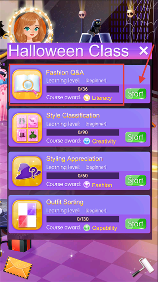 1、进入【Halloween-Class】的【Fashion-Q&A】课程,点击【Start】开始课程,完成后提升【Literacy】,助力服装搭配更专业。