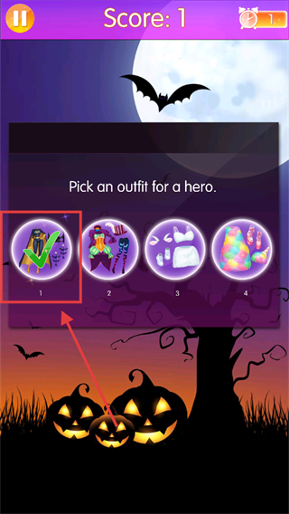 4、选择选项1的英雄风服装(带斗篷)后成功得分,按主题精准选服饰可快速推进游戏并获取分数。
