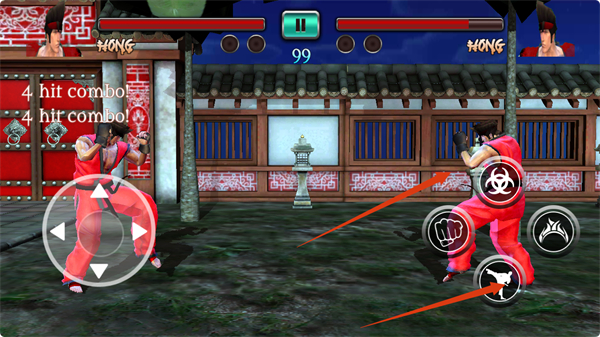 3、对战时,合理组合拳、脚等技能,打出连击,如出现【4-hit-combo!】提示,可有效消耗对手血量。