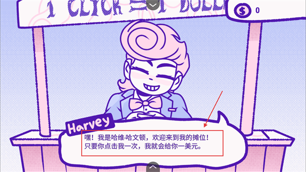 3、在哈维·哈文顿摊位点击他获取【1】美元,重复点击积累初始资金用于后续操作。