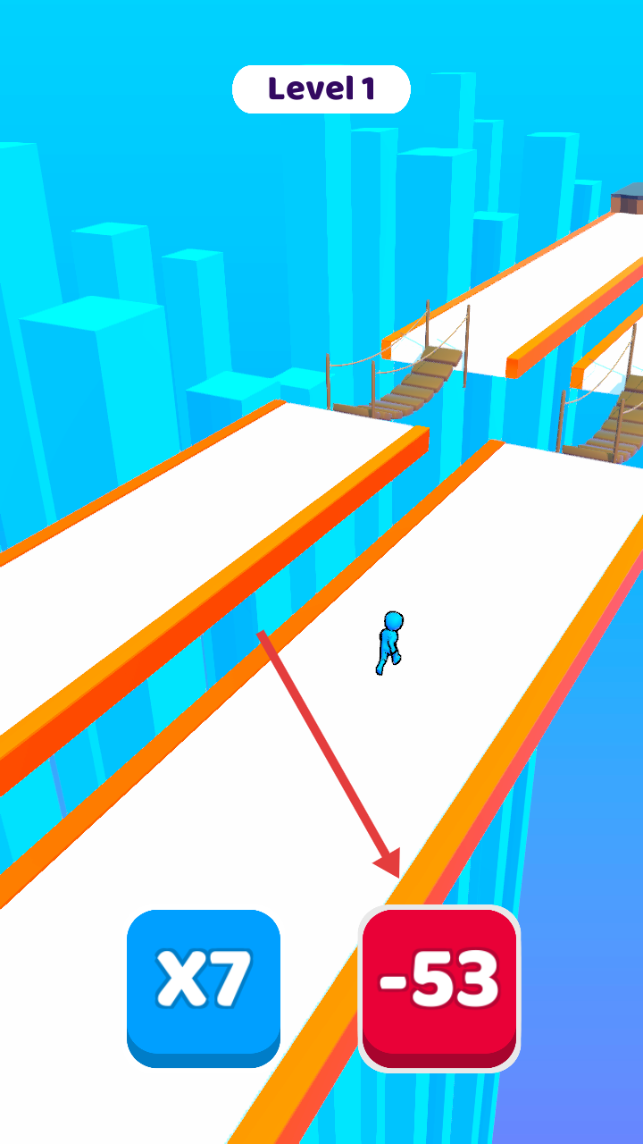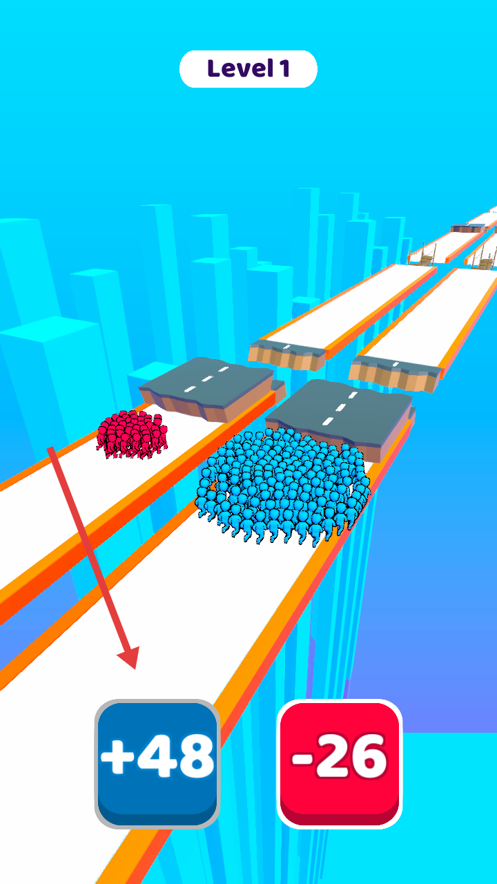 3、合理选路径,保持人群优势,向关卡终点推进,完成人群收集与竞争的关卡要求。