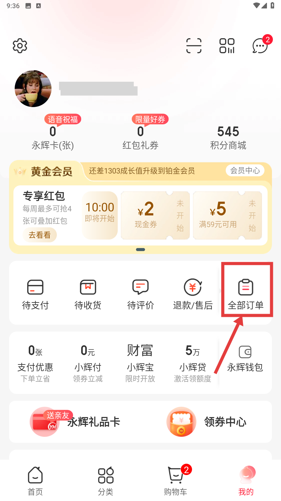 2、进入【我的】页面后,我们点击【全部订单】,就能查看订单啦。