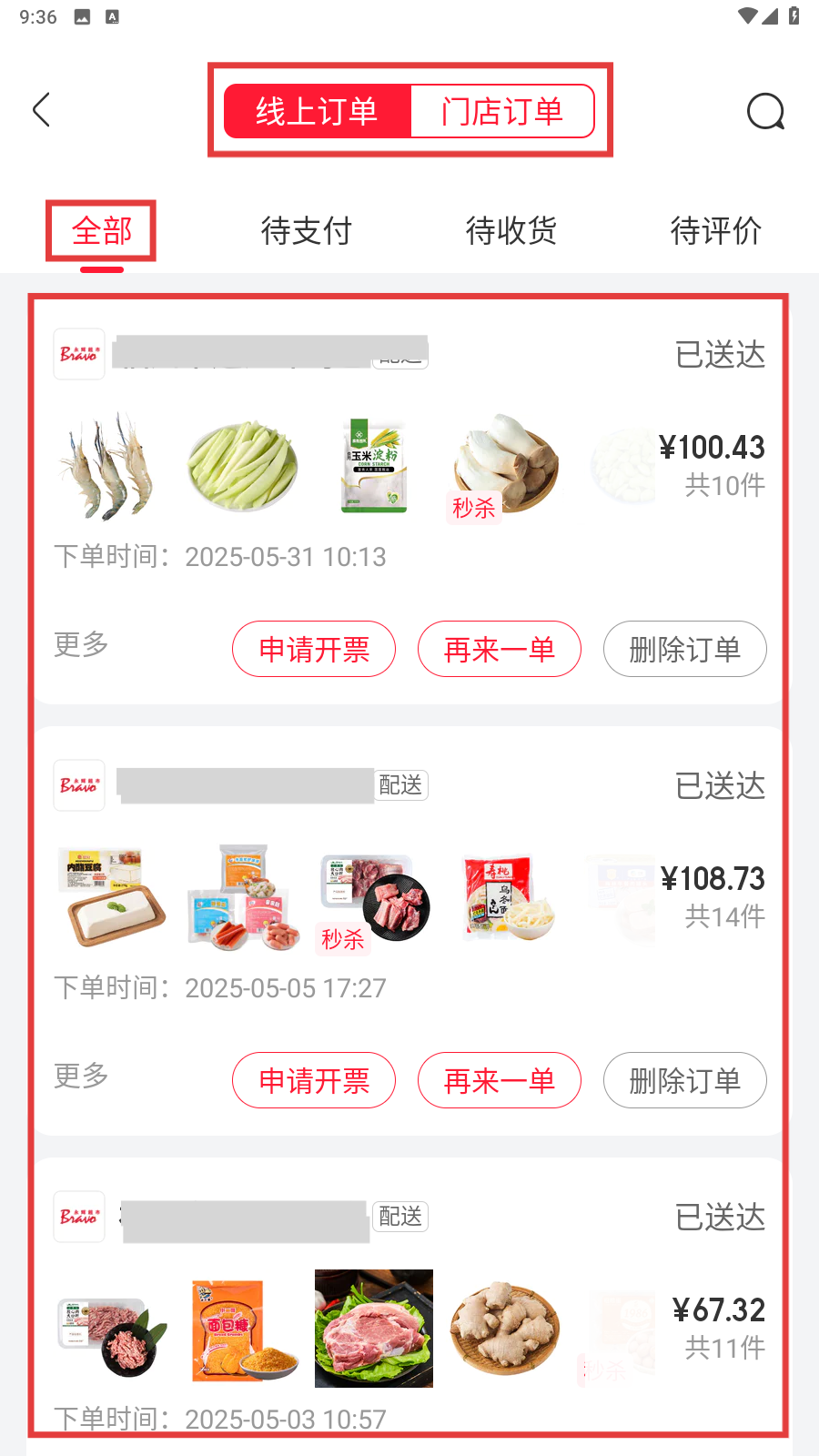 3、在全部订单页面,可切换【线上订单】或【门店订单】,也能按【待支付】和【待收货】等状态筛选呢。