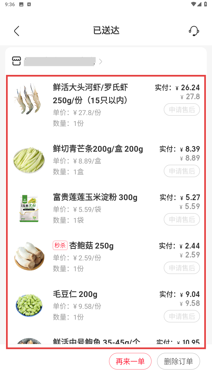 4、点击某条订单进入详情页,像已送达的订单,就能看到每样商品的单价、数量、实付价咯。