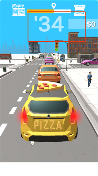 2、真实城市交通模拟:随机出现的堵车路段与突然穿行的车辆,需要实时调整行驶路线以确保准时交付披萨订单。