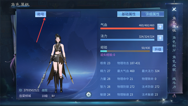 2、在【角色属性】界面,点击【称号】,进入称号系统。