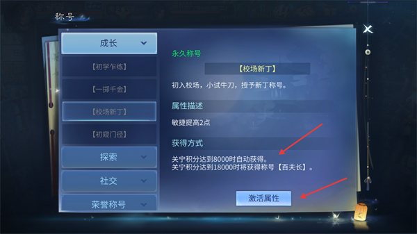 4、查看自身是否达成条件后,点击【激活属性】,获得称号。