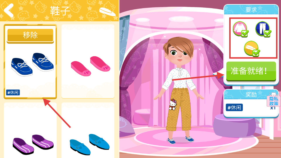 2、挑选【休闲】风格鞋子完成搭配,点击【准备就绪】,获取【休闲】奖励,推进经营任务。