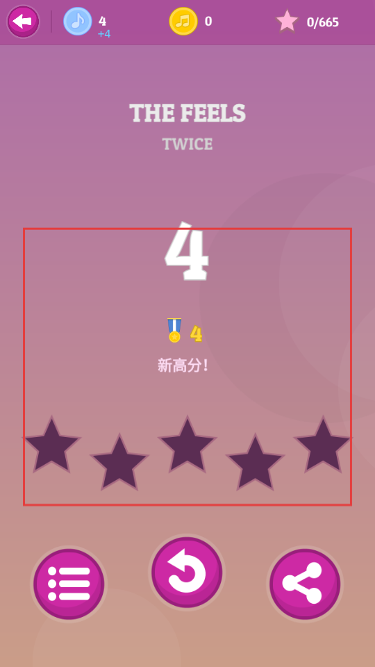 4、演奏结束后,查看分数、星星评价等,可选择重新演奏、查看歌曲列表或分享成绩。