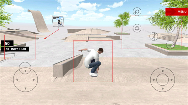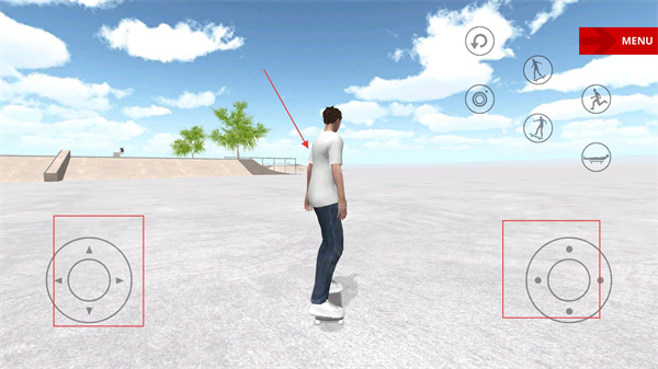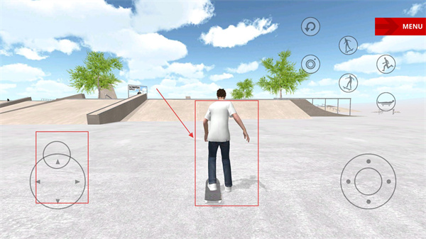 1、通过左侧方向键控制角色移动,右侧按键触发滑板动作(如滑行、跳跃),在滑板场场景中熟悉基础操控逻辑。