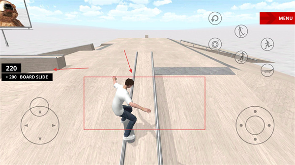 4、在扶手类地形触发BOARD-SLIDE动作,获得200分,长距离滑行类特技得分更高,需保持动作连贯性以提升评分。