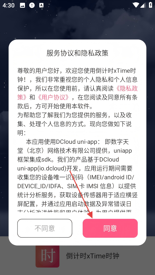 1、在“服务协议和隐私政策”弹窗中点击【同意】,进入倒计时xTime时钟的主界面。