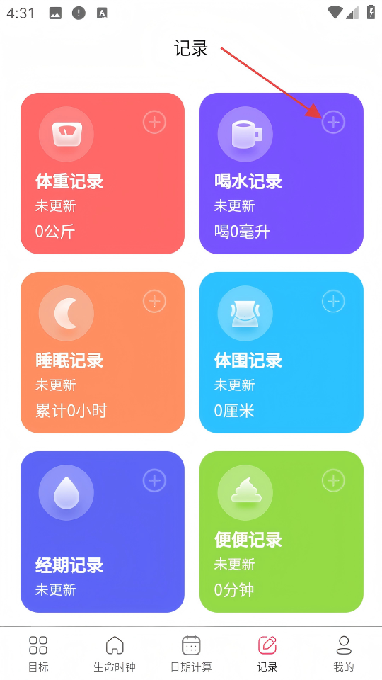 3、在记录页面点击【喝水记录】右上角的“+”号,进入记录喝水的操作页面。