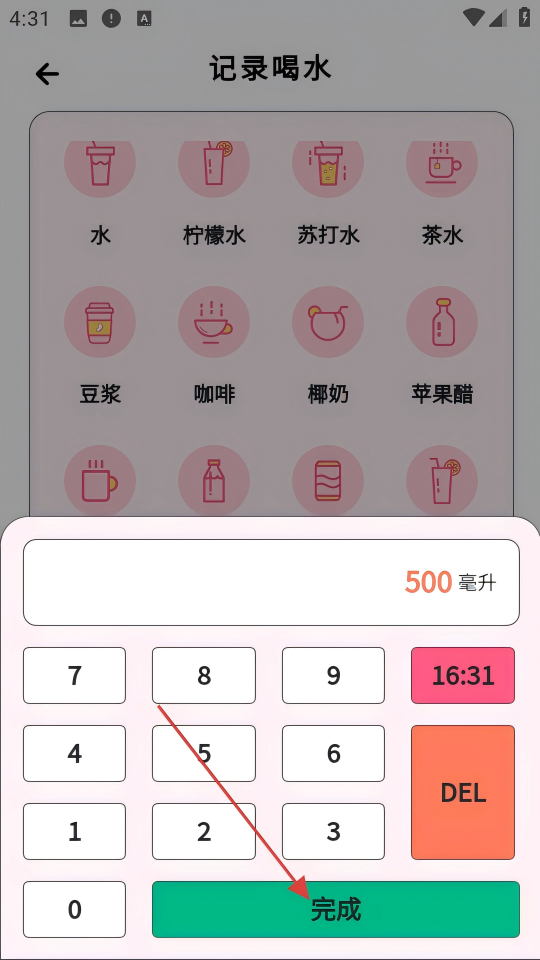 4、在记录喝水页面,选择饮品类型、输入饮水量后,点击【完成】,即可记录本次喝水情况。