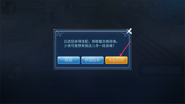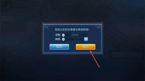 4、发起比武招亲需消耗20000银两,确认拥有足够资源后点击【确定】,即可发起招亲。