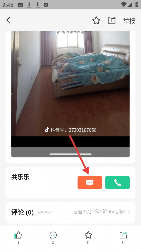 3、在房源详情页面,点击橙色的聊天按钮,可与房源发布者【共乐乐】进行沟通。