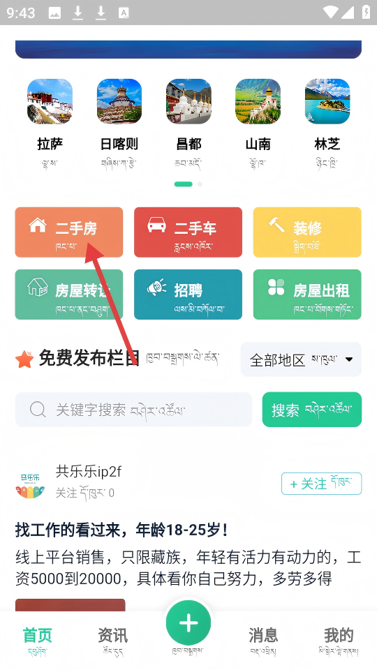 1、在首页点击【二手房】选项,进入二手房信息页面。