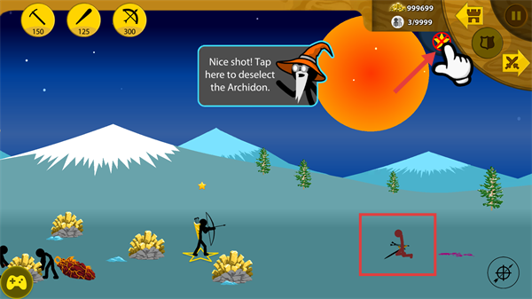 4、收到【Nice-shot-Tap-here-to-deselect-the-Archidon.】提示后,点击对应区域取消选中弓箭手。