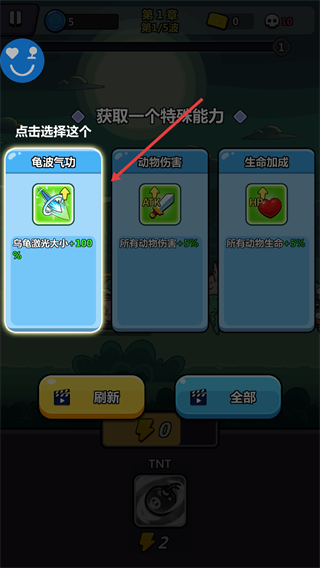 4、积累经验,达到一定等级后,进入特殊能力选择界面,选择对应增益效果,提升后续战斗能力。