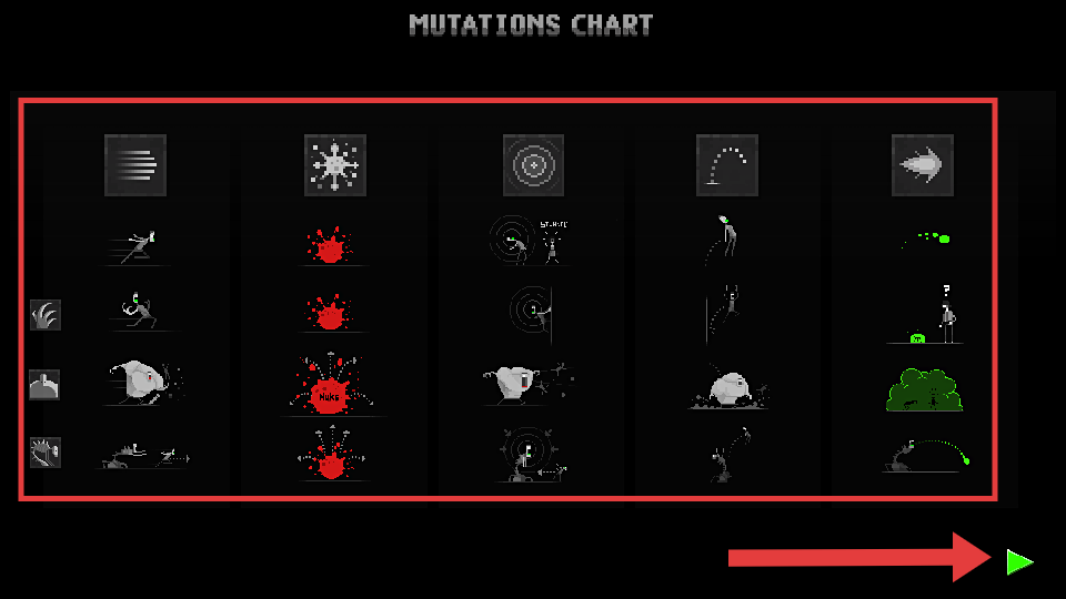 1、在【MUTATIONS-CHART】界面,查看各类变异能力,点击右侧绿色箭头进入游戏,合理选择变异能力提升战力。