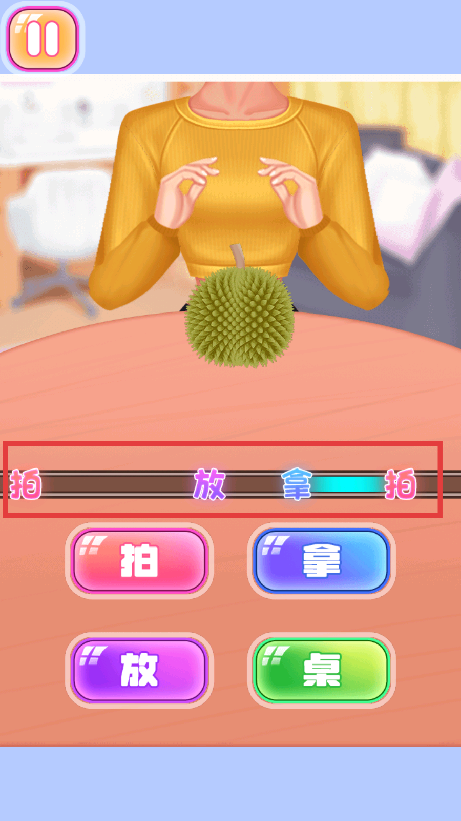 4、通过点击“拍”“拿”“放”“桌”等按钮,完成游戏指令要求。