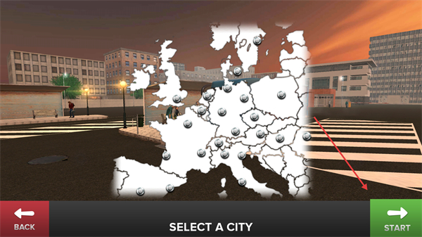 1、在城市选择界面,点击【START】选择欧洲任意城市,开启不同城市的巴士驾驶挑战。