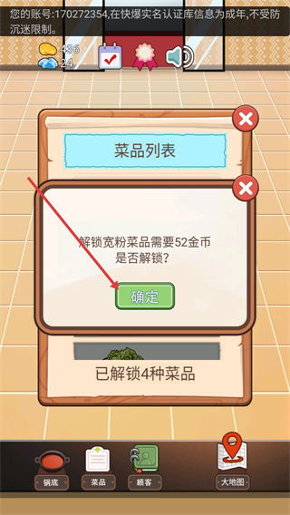 1、可消耗金币解锁新菜品(如解锁宽粉菜品需要52金币),丰富火锅店的菜单,满足顾客的多样化需求。