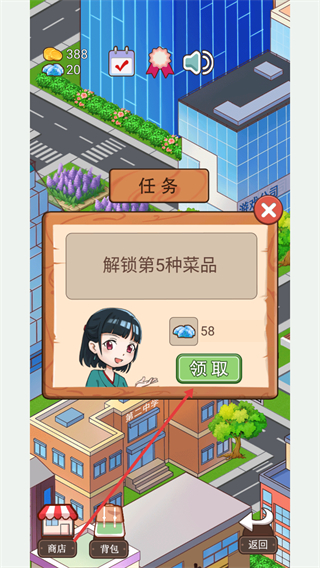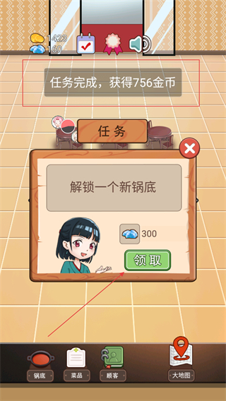 2、完成任务(如解锁第5种菜品)可获得奖励(如金币),这些奖励可用于解锁更多菜品和锅底,提升火锅店的经营资源。