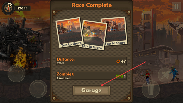 4、完成比赛后,点击【Garage】返回车库,利用收集的资源升级战车部件。
