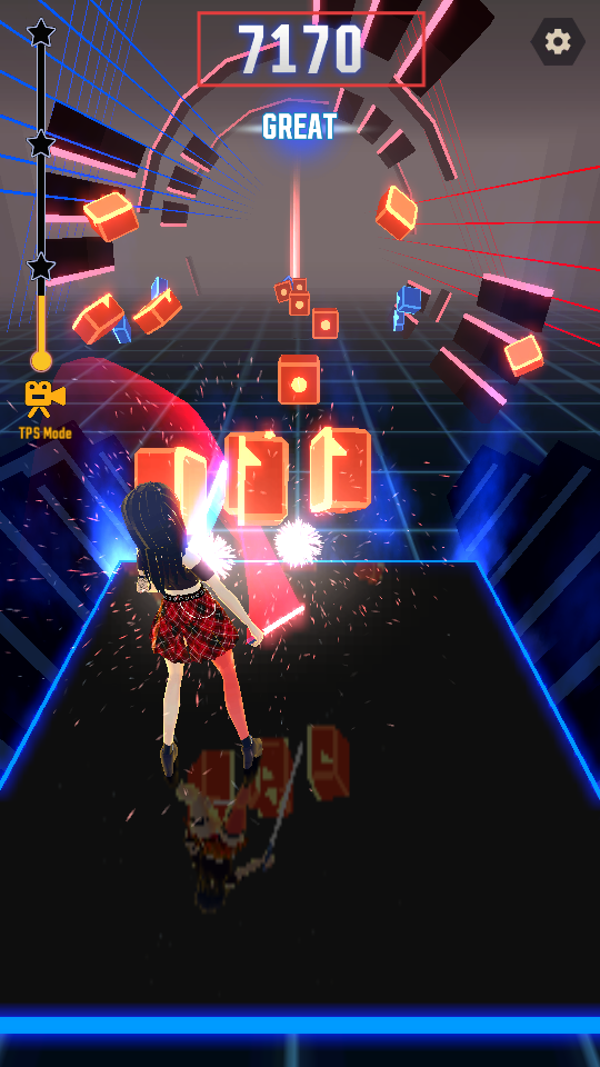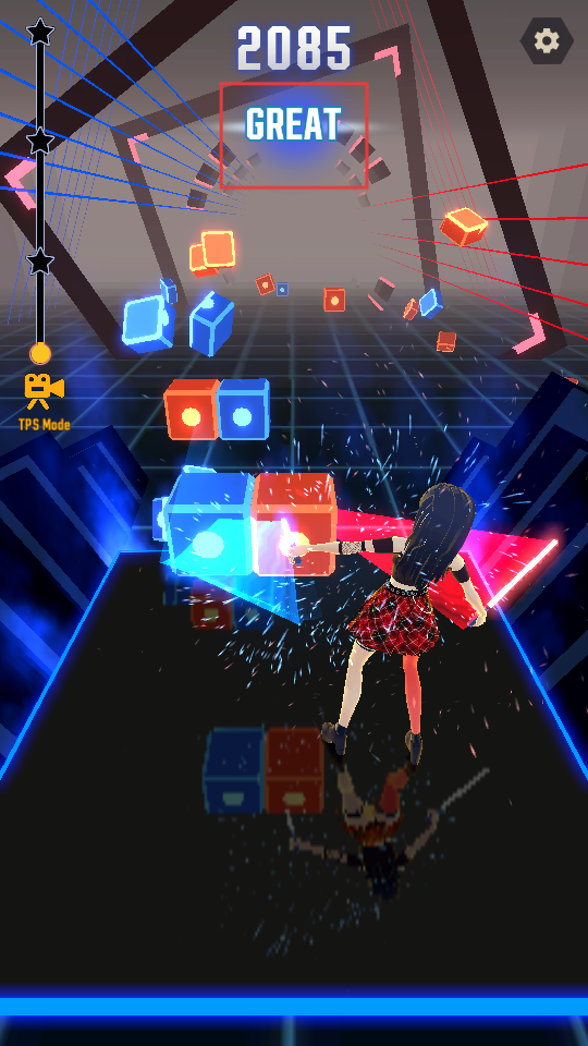 2、跟随音乐节奏,用对应颜色光剑切割前方红蓝方块,获取分数与【GREAT】评价。