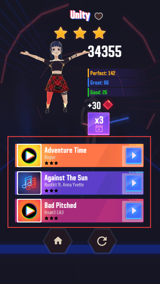4、结算后查看评分与表现,选择【Adventure-Time】【Against-The-Sun】等歌曲继续挑战。
