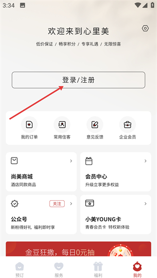 1、在心里美酒店APP界面点击底部【我的】选项,进入个人功能操作区域。