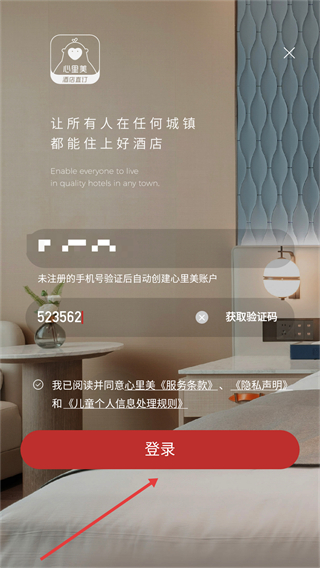 4、完成信息填写后点击【登录】按钮,即可完成心里美酒店账号的登录操作。