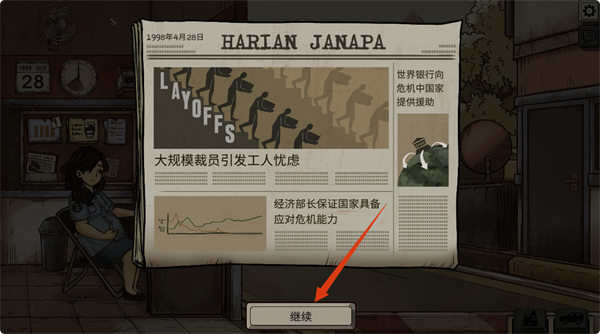 2、在报纸剧情界面,点击【继续】按钮,推进游戏剧情,了解1998年的背景故事。