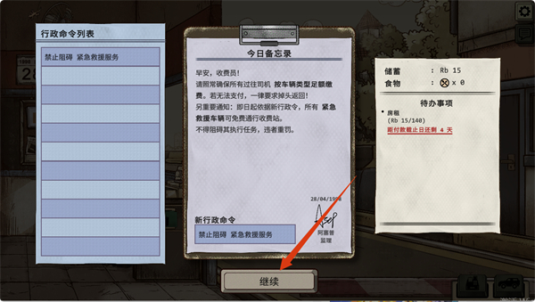 3、查看【今日备忘录】等信息后,点击【继续】按钮,明确收费规则和行政命令,开展收费工作。