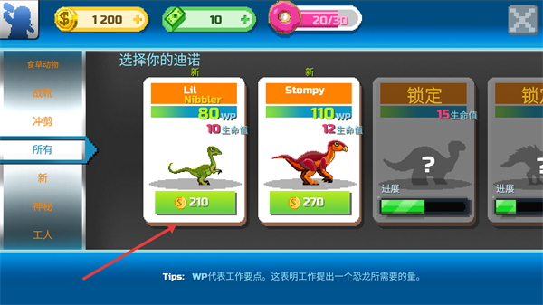1、需选择恐龙进行培育,消耗相应金币,不同恐龙具有不同的工作要点和生命值。