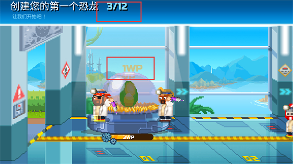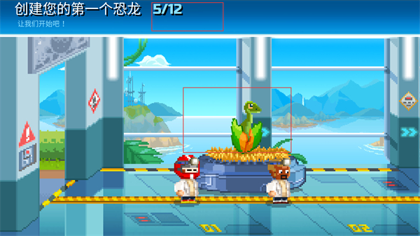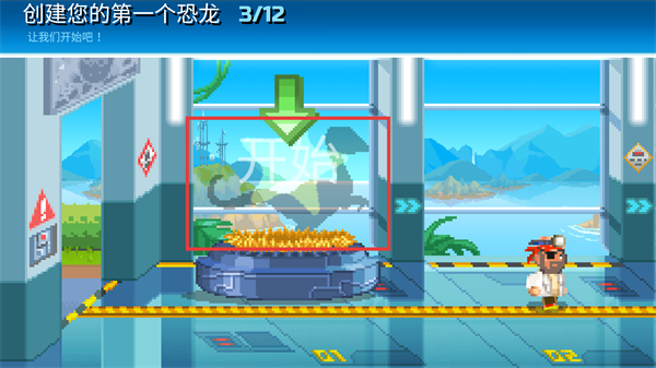 2、开始创建恐龙的流程,点击【开始】进入恐龙培育的具体环节,逐步推进创建进度(如3/12、5/12等)。