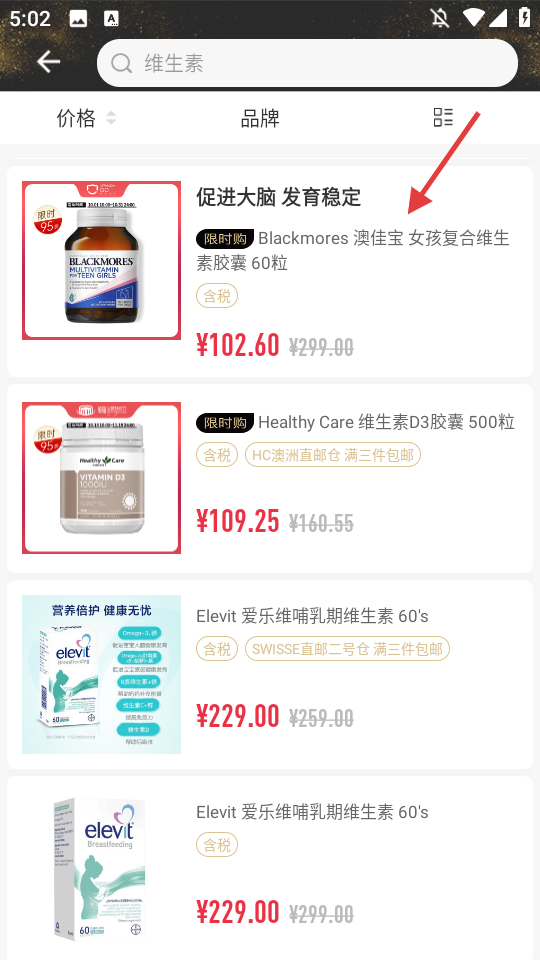3、在搜索结果页,点击想要的商品,进入详情页。