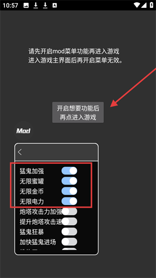 1、进入mod菜单,开启【猛鬼加强】-【无限蜜罐】-【无限金币】-【无限电力】等功能,再点进入游戏,确保作弊效果生效。