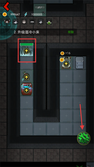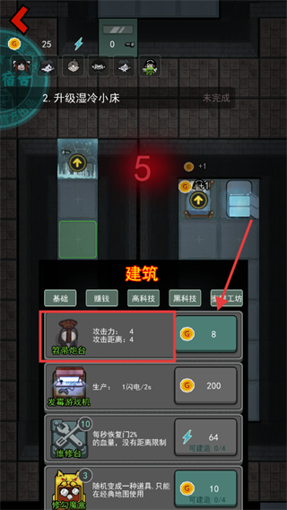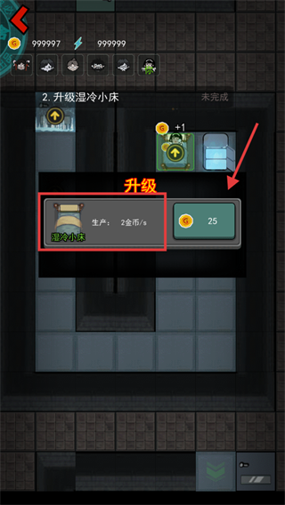 3、攒够25金币时,升级【湿冷小床】,使其金币产出提升至2金币每秒,加快资源积累速度。