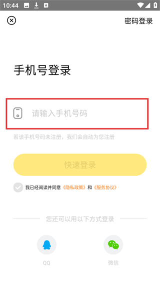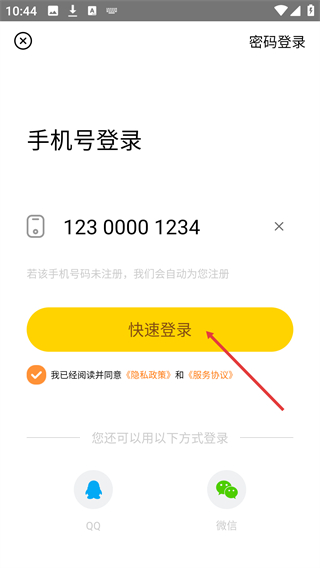 3、在【手机号登录】界面填好号码后,勾选【我已经阅读并同意《隐私政策》和《服务协议》】,再点击【快速登录】按钮。