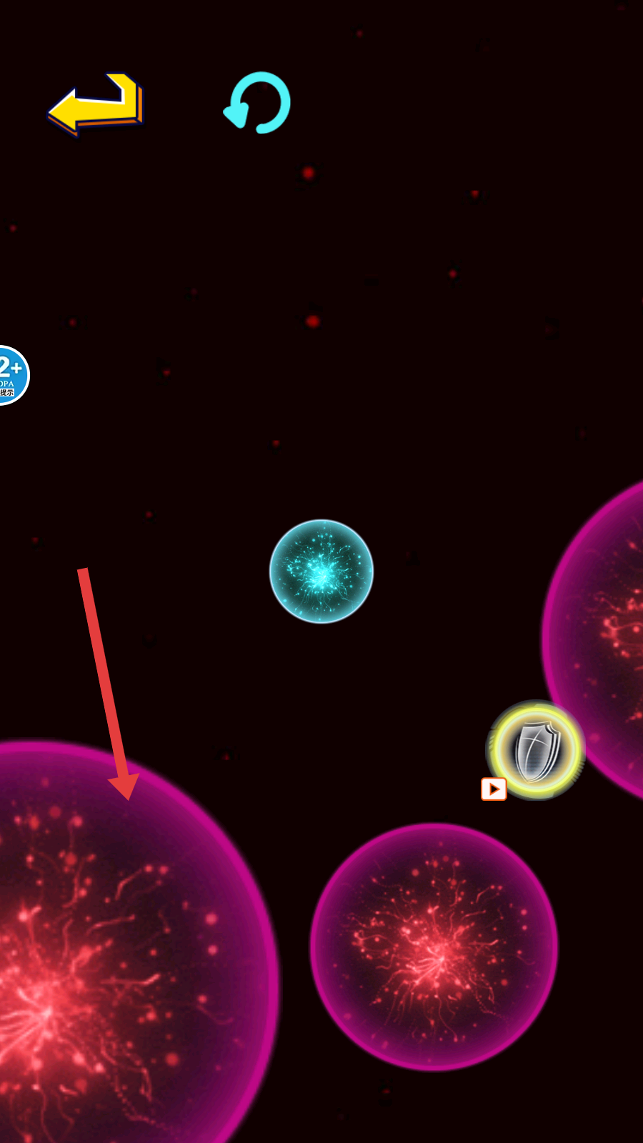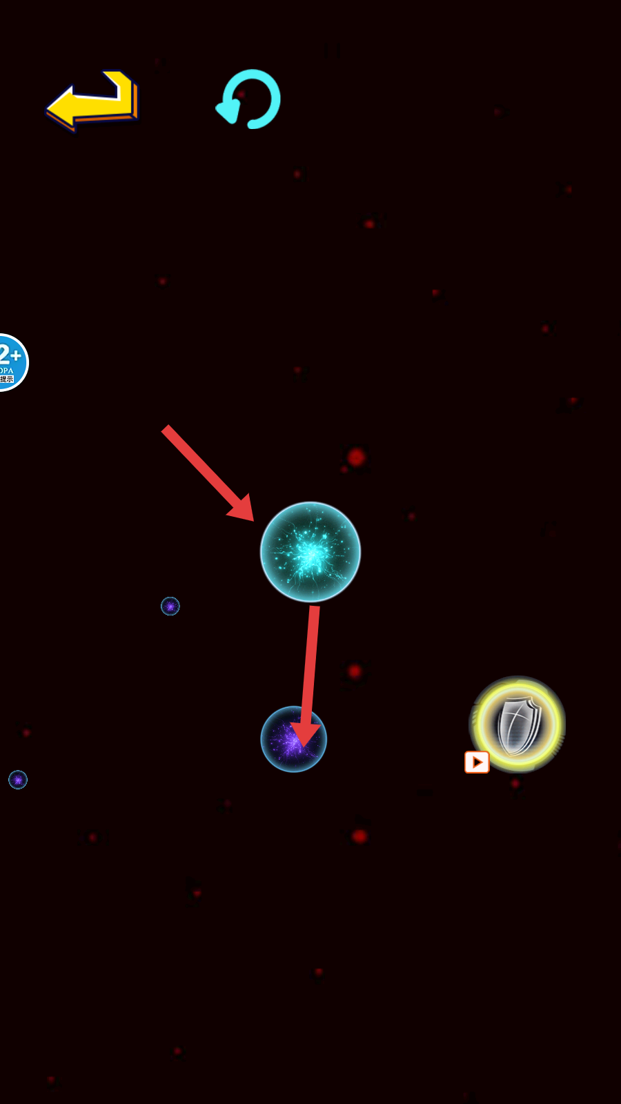 4、避开红色较大球体,继续融合同色球体以成长。