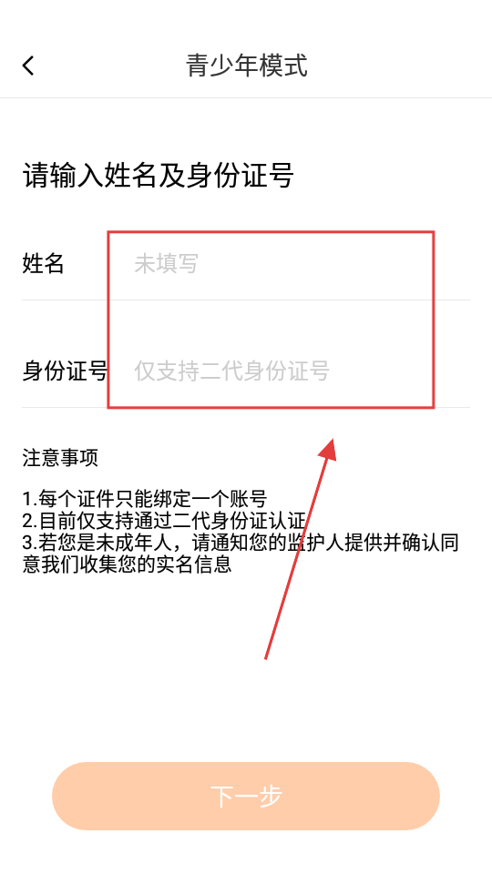 3、点击【开启青少年模式】,进入信息填写页面。
