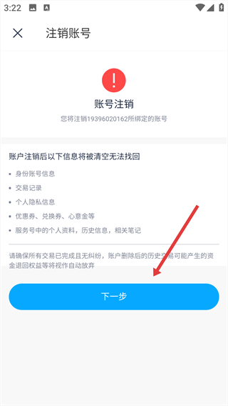 4、查看注销提示后,点击【下一步】按钮,完成账号注销流程。