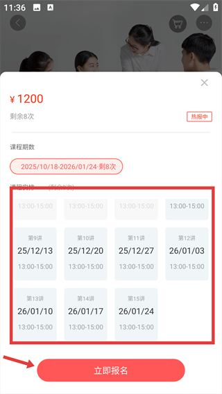 3、点击“立即报名”按钮,弹出课程期数及安排的选择弹窗。