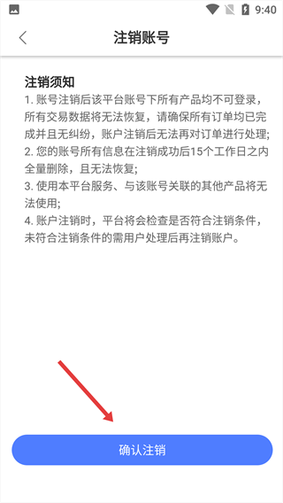 4、在注销账号页面,点击【确认注销】完成账号注销操作。
