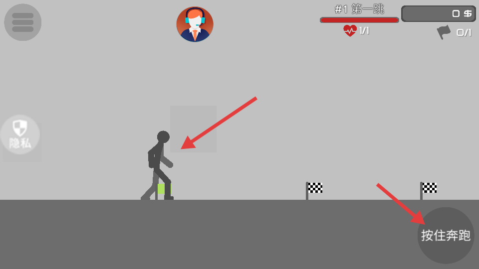3、在关卡中,按住右下角【按住奔跑】按钮,使火柴人向前奔跑。