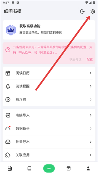 1、打开书伴阅读进入纸间书摘页面,点击右上角设置按钮。